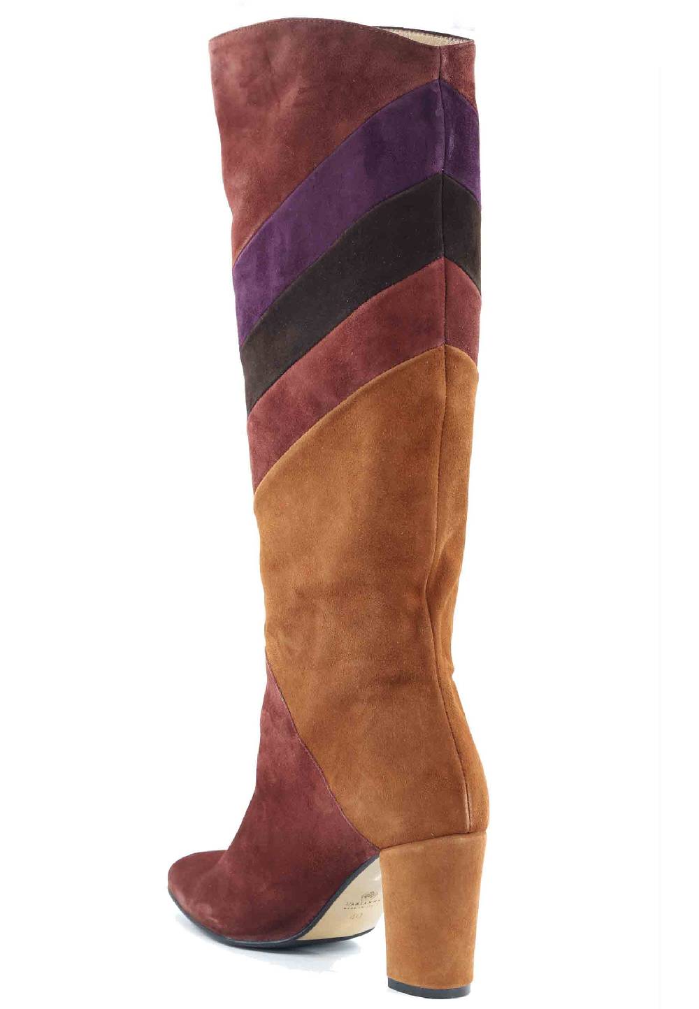 Stivali a tubo da donna firmati L'arianna realizzati in pregiato camoscio marrone con riporti in camoscio multi colore con tacco alto e punta tonda. Made in Italy. Composizione e dettagli: Materiale esterno: pelle. Fodera: pelle. Materiale suola: cuoio e gomma. Altezza tacco: 9 cm. Calzata: regolare